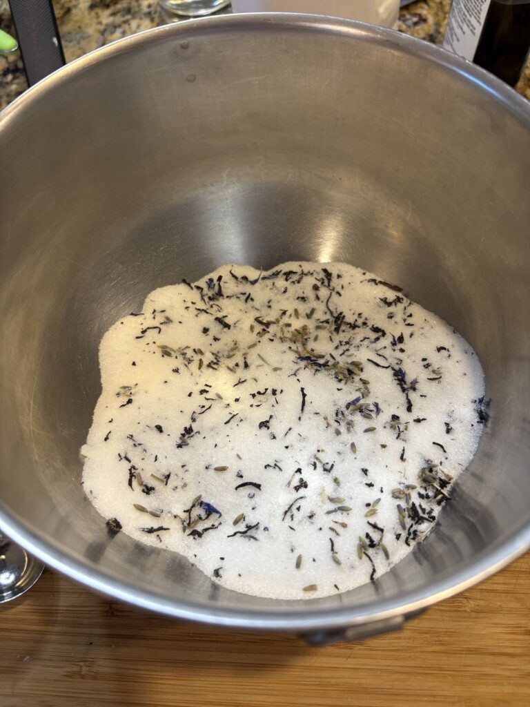 6. Add the tea, lavender, and sugar to the bowl of the mixer.