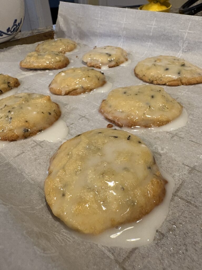 • Dip the tops of the cooled cookies in the glaze and allow to dry. Sprinkle with a tiny bit of lavender if desired.