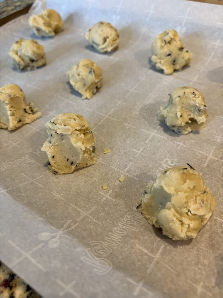 12. Using a cookie scoop or a tablespoon, scoop out the dough and place on the prepared cookie sheets about 1 1/2 inches apart.