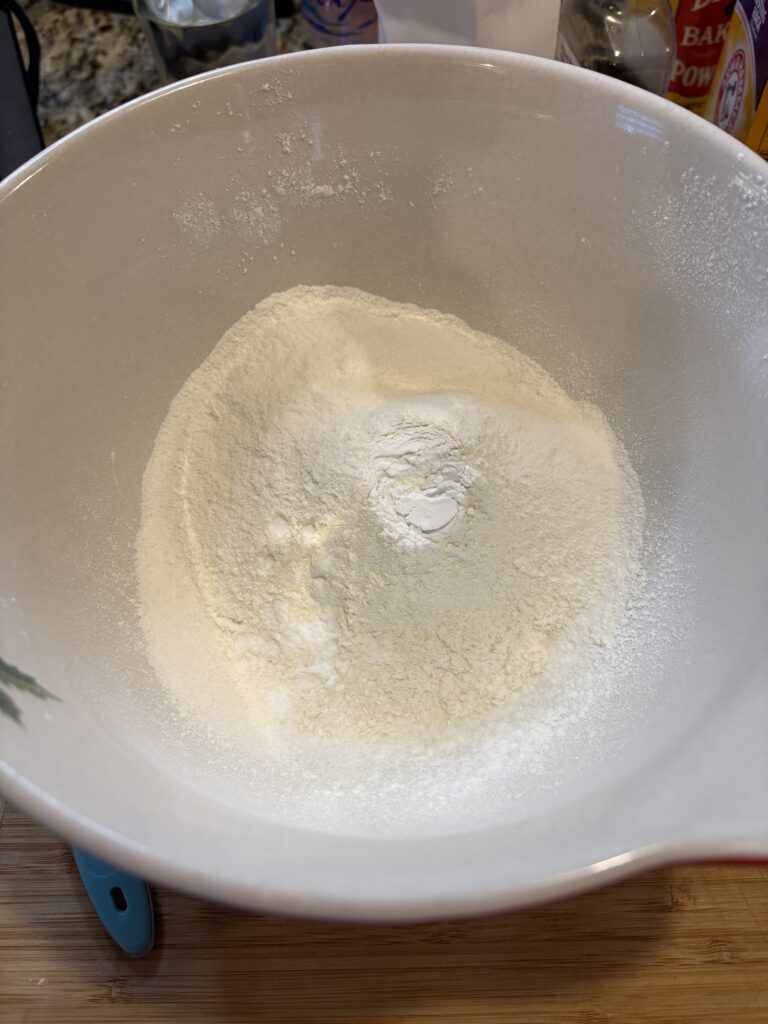 4. Add 1/2 tsp baking powder and 1/4 baking soda into the sifted flour. Whisk to combine.