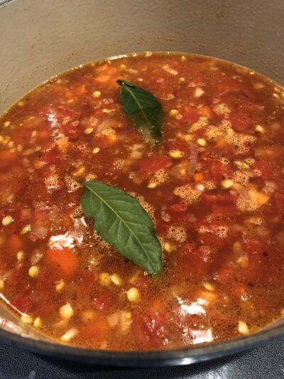 12. Cover and bring to a simmer. Lower to medium heat and cook for about 30 minutes until the vegetables are soft.