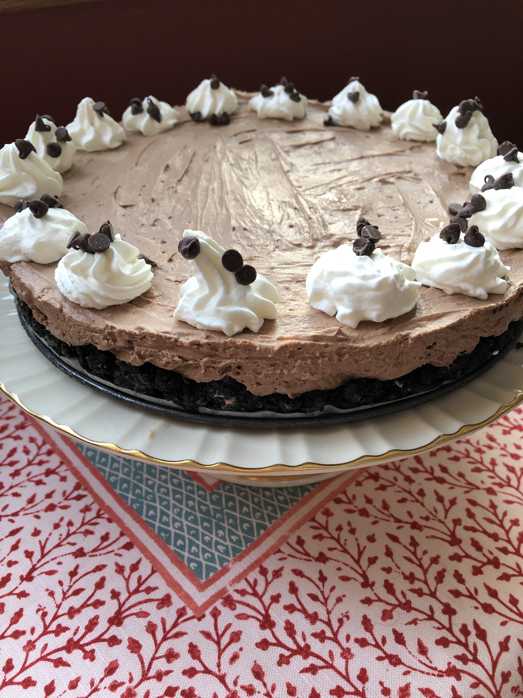 An easy crust: The crisp chocolate crust is made of crushed cookies and melted butter. Five minutes bake time to set the crust and you are ready to fill.