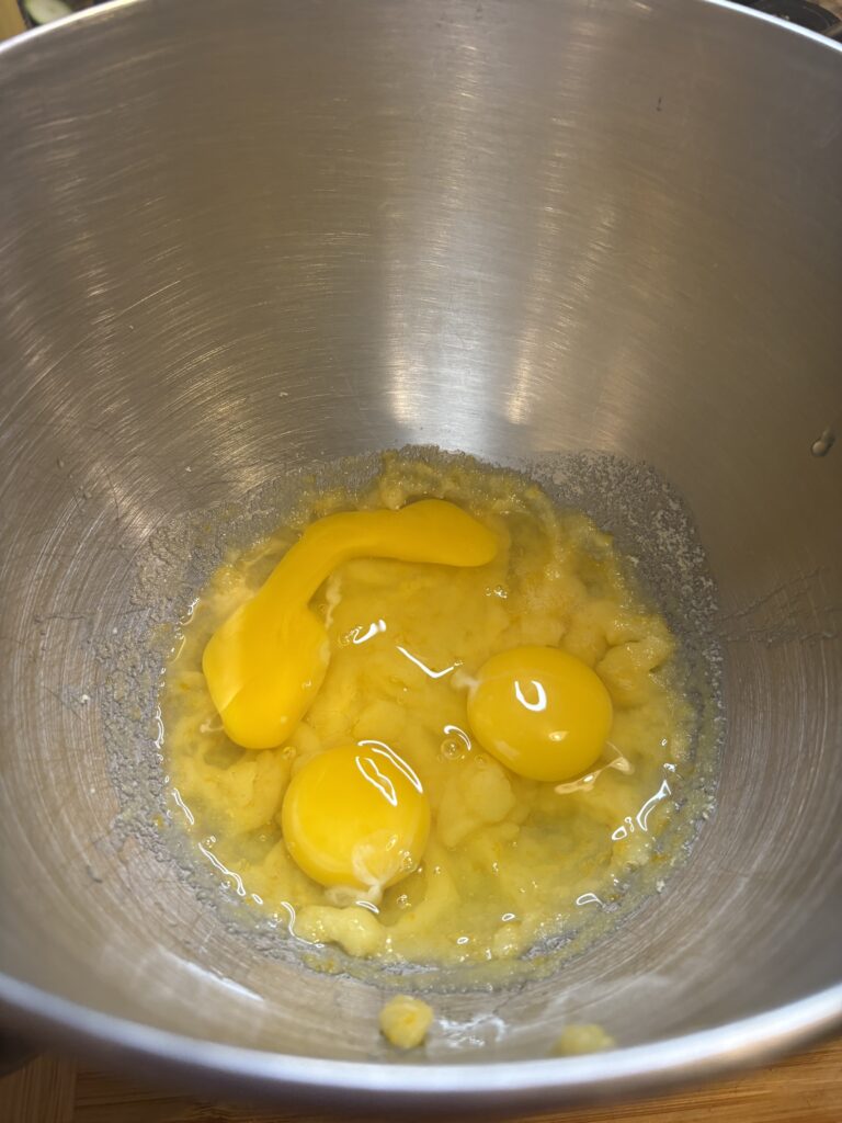 10. Add the eggs and almond extract and mix on low until combined.