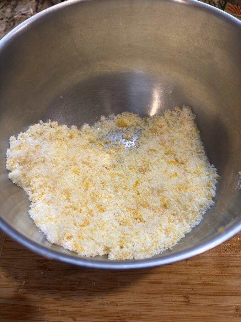 - Combine the orange zest and sugar, rubbing the zest and sugar between your fingers. Set aside.