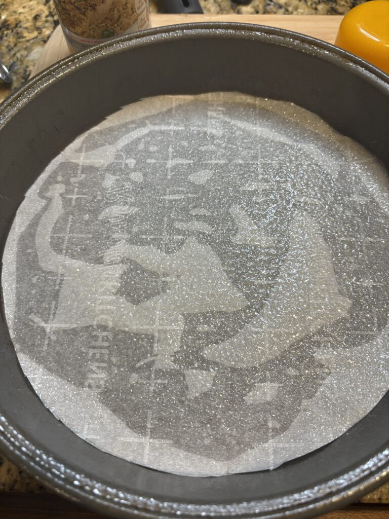 - Prepare the pan. Cut out a circle of parchment paper to fit in the bottom of the pan. Spray the pan with non-stick cooking spray. Place the circle of parchment paper in the bottom of the pan and spray that as well. Set aside.