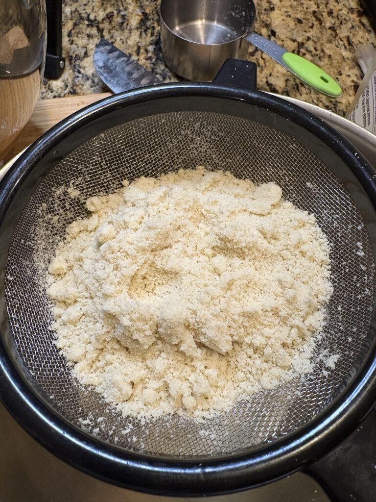 Almond flour can be lumpy, so don’t neglect to sift it. You don’t want chunks of almond flour in your cake. You can add the almond flour to a fine mesh sieve placed over a bowl. It is thicker than flour, so you can gently push it through with a spoon or with bottom of a measuring cup.