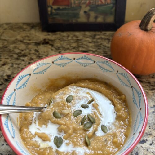 Toppings: There are so many possibilities! I like to add sour cream (to so many things!) and a sprinkle of pumpkin seeds (roasted pepitas), but you can also add a dollop of great yogurt or a drizzle of cream with a light sprinkling of cinnamon. If you have time and extra bread, homemade croutons are also great.