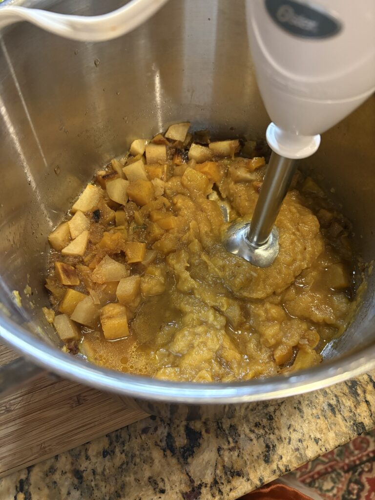 13. Remove the pot from the heat and blend with an immersion blender, blending in various sections of the pot until the big chunks are broken down. You should choose to blend until you reach the desired texture, leaving larger pieces if you like or blending until it achieves a silky texture.