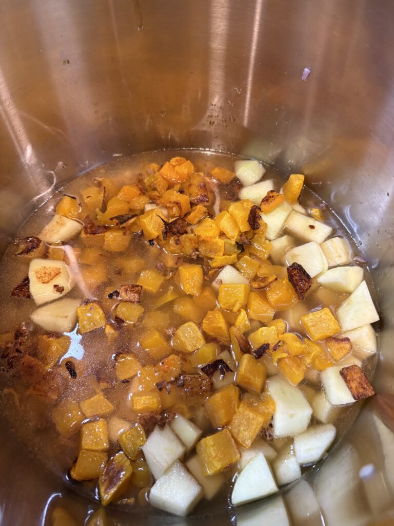 Try to cut your apples into about the same size as the butternut pumpkin pieces so that they are done cooking at the same time.