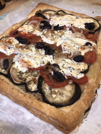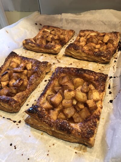 A buttery, flaky crust made of FROZEN puff pastry. It’s always a great idea to have frozen puff pastry on hand since it is a great base for tons of delicious desserts like Easy Homemade German Apple Strudel with Puff Pastry and Puff Pastry Tarts with Homemade Apple Pie Filling. You can even use it to make savory dishes like Easy Summer Recipe: Roasted Eggplant and Tomato Tart.