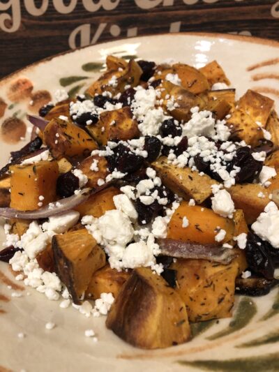 Roasted butternut squash is a fantastic autumn ingredient – versatile and pairing well with all sorts of spices. We like to have roasted butternut squash tossed with a bit of olive oil and herbs as a simple and flavorful side dish. When we’re looking for something a little more fancy, though, I love to make this Roasted Butternut Squash Galette with Goat Cheese. This super tasty tart includes roasted butternut squash, thin slices of red onion, and a sprinkle of thyme and herbes de Provence topped with handfuls of goat cheese and dried cranberries wrapped up in a store bought pie crust. It looks and tastes great, but couldn’t be easier to make. I think it makes a great alternative to traditional Thanksgiving sides, but it is just as welcome on our weeknight table because it is so simple to prepare.